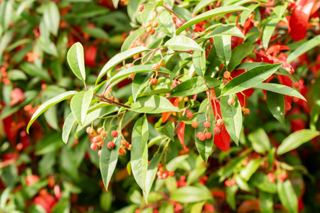 Saint Gallen, Switzerland, October 19, 2025 Photinia Davidiana or chinese photinia plant at the botanical garden