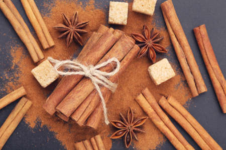 Star anise, cinnamon and ground cinnamon from close range on a black background