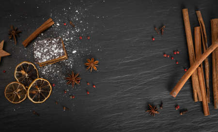 cinnamon sticks framing a black papaer background. Christmas holiday season spiced mulled wine marketing banner