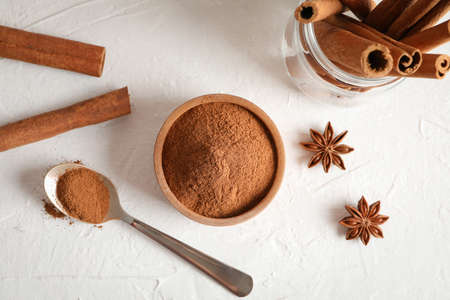 Aromatic cinnamon sticks and powder on light background