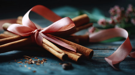 Cinnamon sticks tied with pink ribbon on a rustic wooden table with floral elements