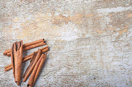 Cinnamon sticks on wooden background.