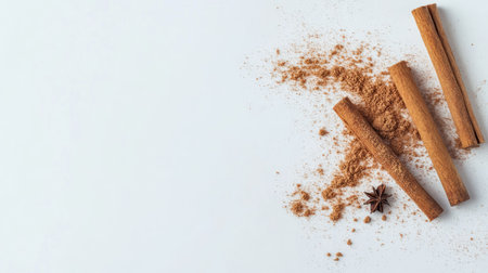 A top-down view featuring cinnamon sticks and a sprinkle of ground cinnamon on a white surface, ideal for culinary themes, recipes, and wellness imagery.
