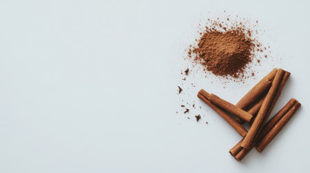 A minimalistic arrangement featuring ground cinnamon and cinnamon sticks on a white background, perfect for culinary and food styling themes.