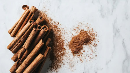 Discover the rich texture and warm tones of cinnamon sticks and powder on a marble surface. Ideal for culinary uses and seasonal recipes.
