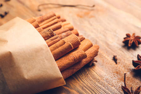 Close up shot of aromatic dry cinnamon sticks on wooden table background, Selective focus