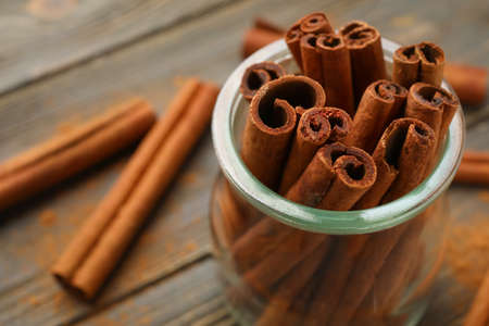 Cinnamon sticks in jar on wooden background