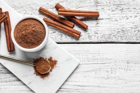 Cinnamon sticks and cinnamon powder on wood