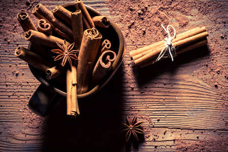 Cinnamon sticks and cocoa powder on a wooden table. Selective focus.