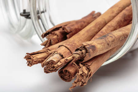 Cinnamon barks come out of overturned glass jar, on white