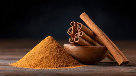 A visually appealing arrangement of ground cinnamon powder alongside fresh cinnamon sticks in a wooden bowl, perfect for culinary applications and rustic decor.
