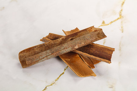 Closeup detail - Heap of cinnamon bark sticks on white stone like desk