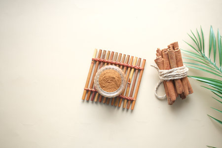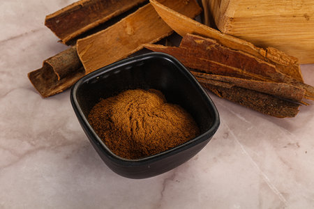 Natural Cinnamon powder in the bowl with sticks