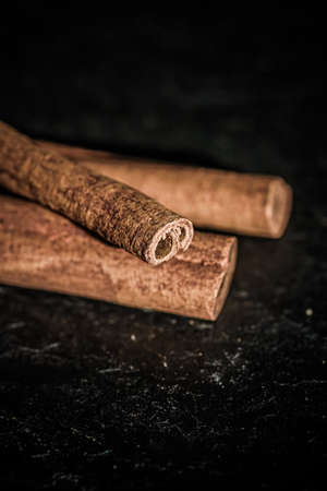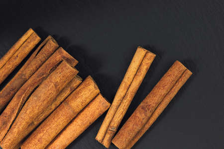 Cinnamon sticks isolated on black slate background with selective focus - close up horizontal image of cinnamon spice