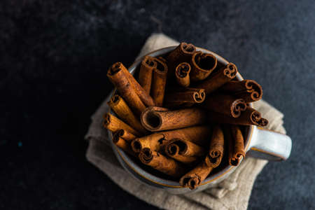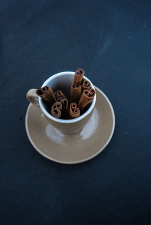 Coffee mug full of organic cinnamon sticks on dark background with copyspace
