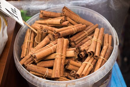 Cinnamon sticks on the market, background texture