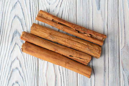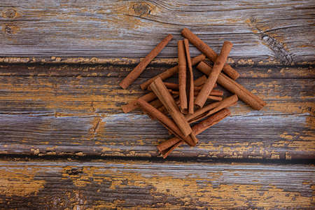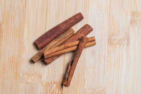 The whole cinnamon is in a pile on a wooden board. Flatlay photo