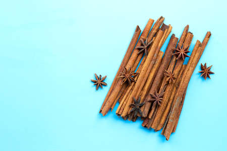 Star anis and cinnamon sticks on blue background.