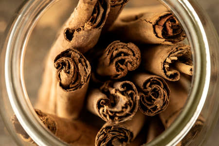 Some cinnamon sticks in a glass bowl. Selective focus points. Blurred background