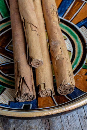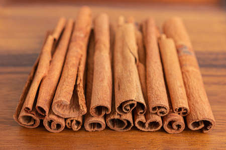 Close up shot of aromatic dry cinnamon sticks on wooden table background, Selective focus