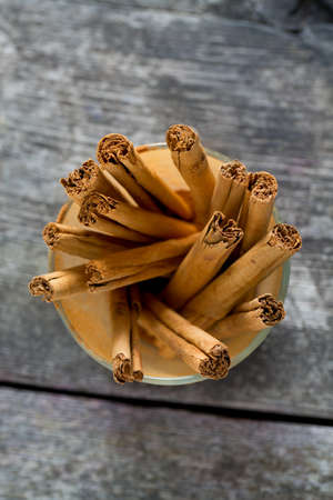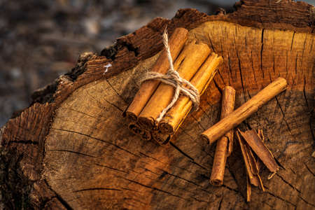 Organic Raw Brown cinnamon sticks on old wooden table wood stump trunk outdoor