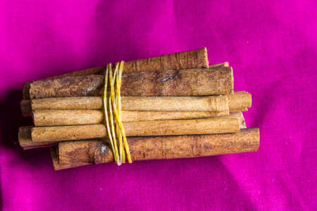 Cinnamon sticks or bark on red cloth, landscape