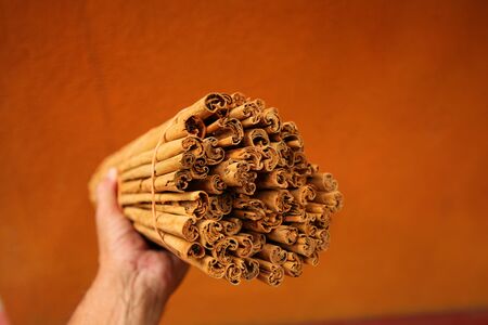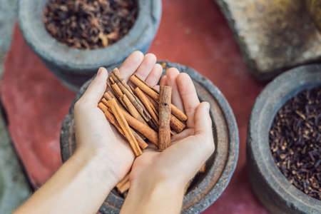 Cinnamon sticks in female hands on a background of spices.
