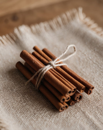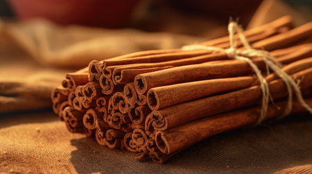 AI Generated. Close up of cinnamon sticks bound with twine on a natural fiber mat for rustic aesthetic appeal