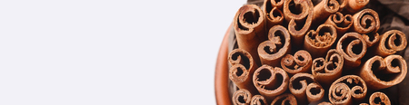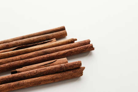 Heap of natural organic cinnamon bark sticks on white board, space for text down.