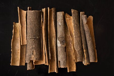 Bunch of dry cinnamon on black table, spice