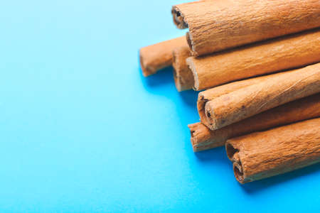 Cinnamon sticks on color background, closeup