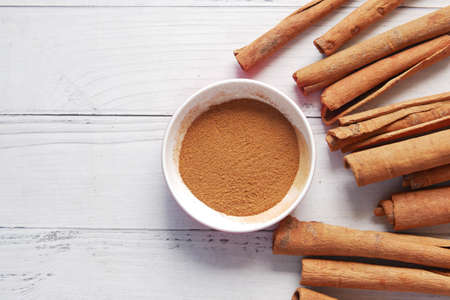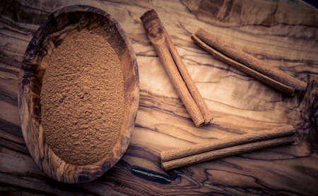 Cinnamon sticks and cinnamon powder on wood