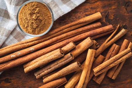 Cinnamon sticks and cinnamon powder on wood