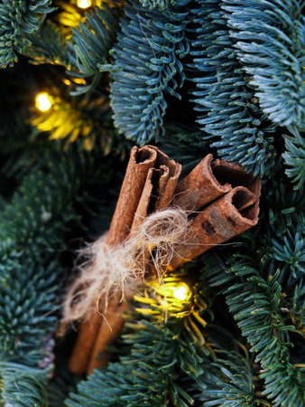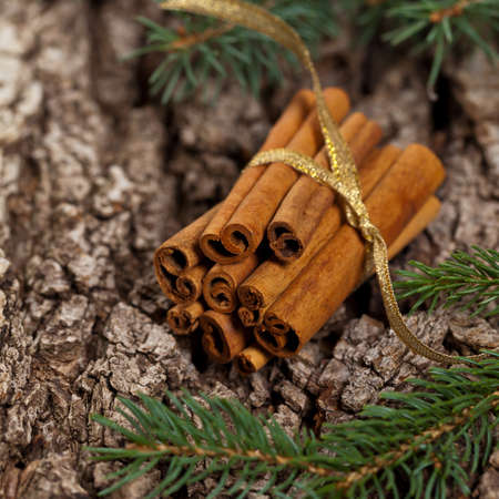 This image showcases bundles of cinnamon sticks tied with twine, alongside pine cones and evergreen foliage. The warm brown tones of the cinnamon contrast with the green of the foliage. The composition is close-up, highlighting texture and detail, suggesting a natural setting. Suitable for use in a variety of commercial and editorial projects.