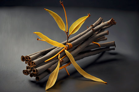 Bundle of dry vanilla beans with yellow leaves, created with generative ai