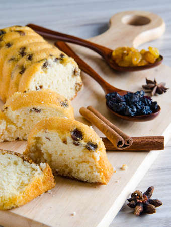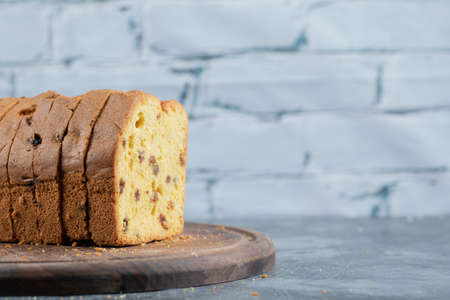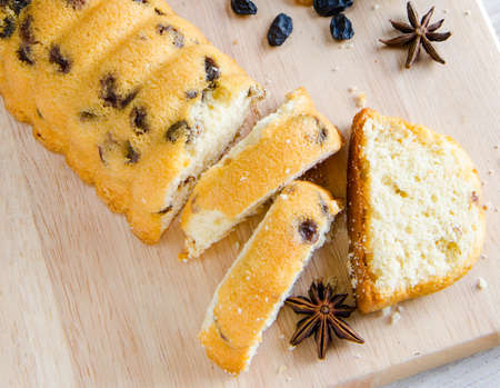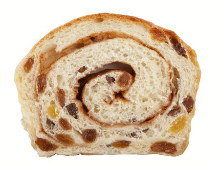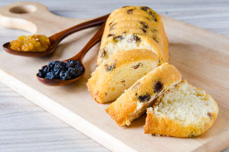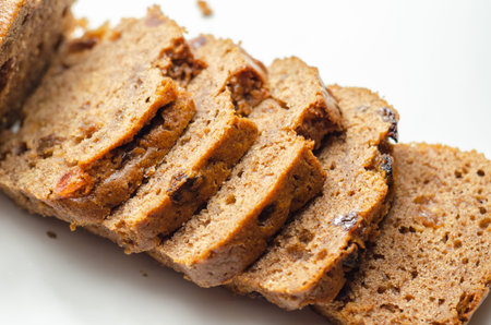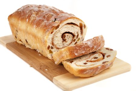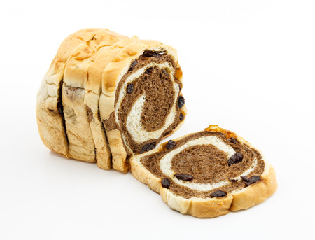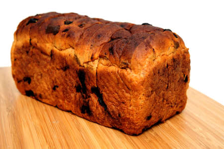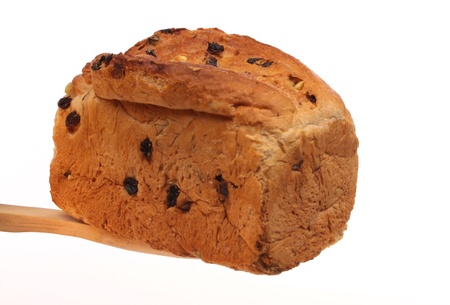 Fruit loaf with sultanas and orange flavored pieces on the white background, traditional fruit bread