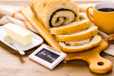 Fresh artisan sourdough cinnamon swirl bread on the table.