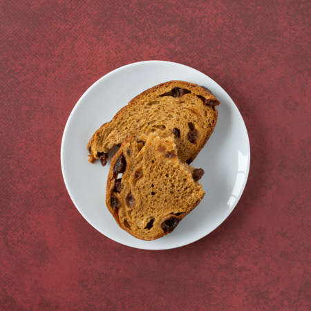 Top view of a pumpkin raisin bread slice broken in half on a white spotted plate atop a mottled maroon table illuminated with natural lighting.