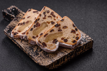 Stollen, a German Christmas pastry and dessert with fruit and marzipan, is perfect for the winter holiday table. Stollen as a food background for your design