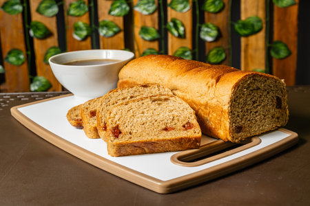 Sliced bread - Homemade slices of bread on a wooden plate and cup of coffee on old wooden table background. Select focus.