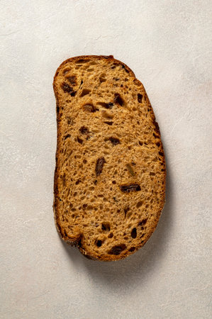 Freshly healthy Sliced ??bread with walnuts and raisins on cutting board on gray stone background. Copy space.