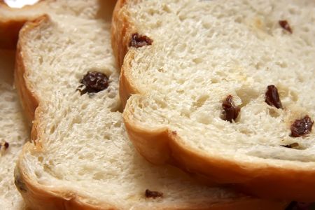 Slices of raisin cinnamon bread with slices laid out showing the detail in the slice including the raisins