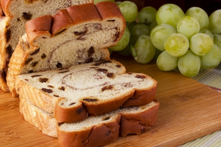Loaf of sliced cinnamon raisin bread on a wooden cutting board