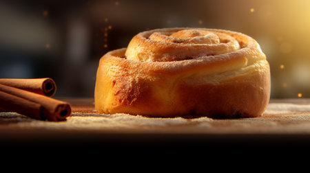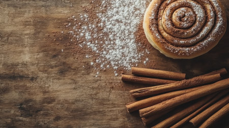 A beautifully baked cinnamon roll sits on a rustic wooden table, adorned with a sprinkle of powdered sugar and surrounded by cinnamon sticks and spice, evoking a warm and inviting atmosphere.