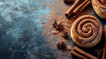 Enjoy a close-up view of freshly baked cinnamon rolls, enhanced by cinnamon sticks and fine spice. Perfect for showcasing warmth and comfort in culinary photography.