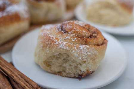 Home made Kanelbullar - Swedish cinnamon buns or rolls. Freshly baked buns on a white marble table top view