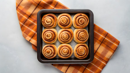 Homemade cinnabons in baking dish are taken out of the oven. Front view.