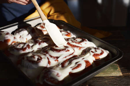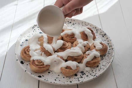 human hand pouring milk sauce or frosting on cinnamon swirls. selective focus. homemade cinnamon rolls with cream glaze. home cooking concept.