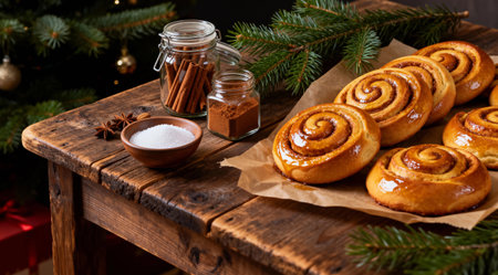 Glazed cinnamon rolls arranged on wooden table with jars of spices and evergreen branches in warm Christmas setting.