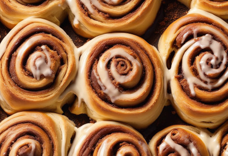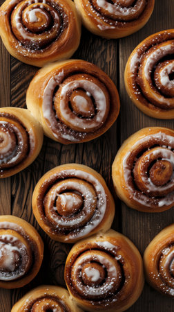 A tempting display of freshly baked cinnamon rolls drizzled with creamy icing, perfect for a cozy breakfast or snack. Ideal for culinary enthusiasts.